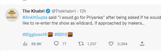 अंकित ने यह भी बताया कि वह वाइल्ड कार्ड कंटेस्टेंट के तौर पर वापस घर में जाना चाहेंगे या नहीं। उन्होंने कहा कि वह प्रियंका के लिए वाइल्ड कार्ड एंट्री लेना पसंद करेंगे।