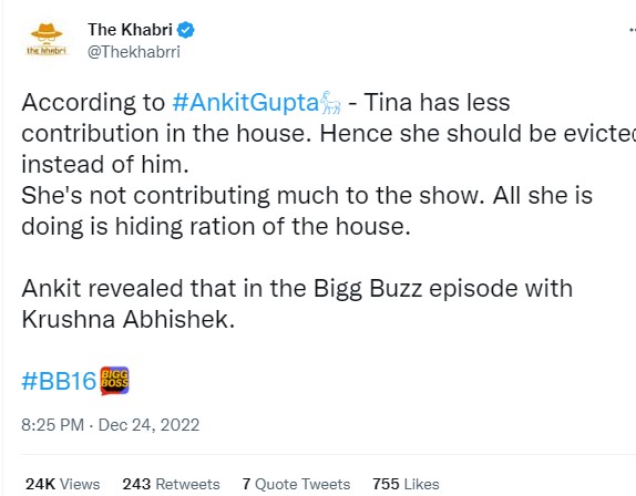 अंकित ने कहा कि उनकी जगह टीना दत्ता को एलिमिनेट किया जाना चाहिए था। शो में उनका कोई योगदान नहीं। वह घर का राशन छुपा देती हैं। अंकित का मानना है कि टीना फ्रंटफुट पर खेलने की बजाय बैकफुट पर खेलतीं हैं।