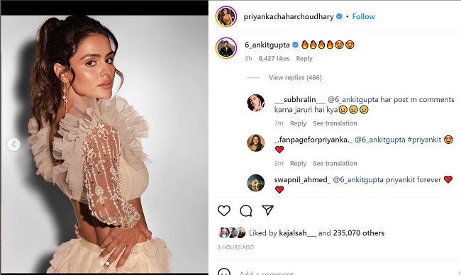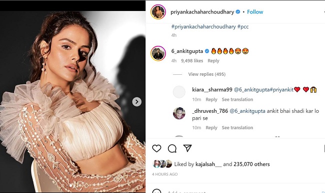 प्रियंका चाहर चौधरी की तस्वीरें इंस्टाग्राम पर वायरल हो गई है। इसे 4 घंटे में 2 लाख 35 हजार के करीब लाइक्स मिले हैं। वहीं, इस पर हजारों कमेंट भी किए गए हैं। अंकित गुप्ता के कमेंट को भी 4 हजार के करीब लाइक्स मिले हैं। कई लोगों ने इस पर मजेदार कमेंट किया है। एक ने लिखा है, 'प्रियंका अंकित।' एक ने लिखा है, 'प्रियंका फॉरएवर।' वहीं, एक ने लिखा है, 'क्या हर पोस्ट पर कमेंट करना जरूरी है।' वहीं, एक ने लिखा है, 'आप दोनों शादी कर लो।'