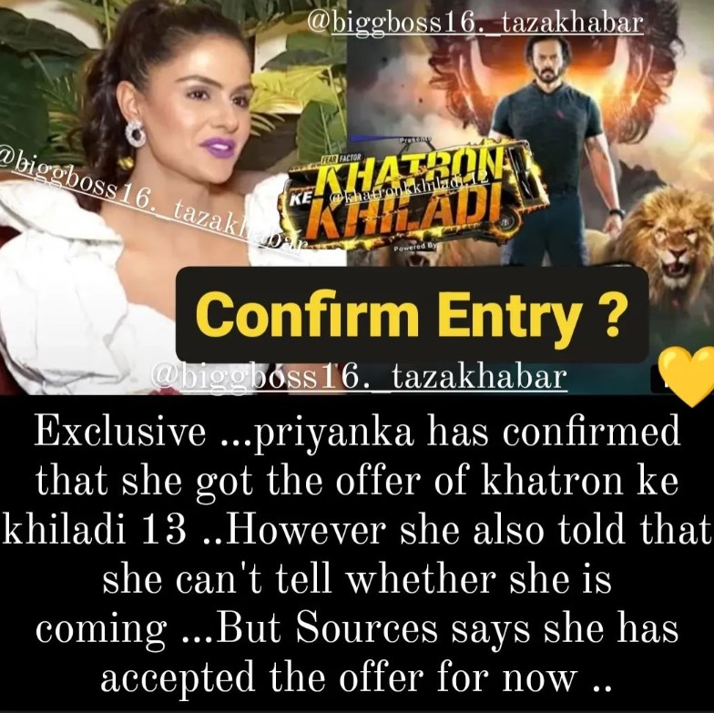 दरअसल, 'उडारियां' फेम इस एक्ट्रेस को लेकर यह खबर है कि इन्हें 'खतरों के खिलाड़ी 13' में देखा जा सकता है। प्रियंका को यह शो तो ऑफर किया ही गया है, अब मीडिया रिपोर्ट्स के अनुसार, यह कन्फर्म है कि वह इस शो का हिस्सा भी बनेंगी। इससे पहले भी इस तरह की खबरें आती रही हैं कि उन्हें शो के लिए अप्रोच किया गया है, लेकिन उनके कन्फर्मेशन की आधिकारिक जानकारी सामने नहीं आई।
