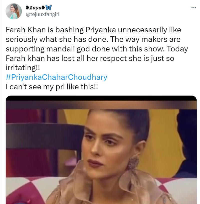 फराह पर कमेंट करते हुए एक यूजर ने कहा, "फराह बिना वजह प्रियंका को डांट लगा रही हैं, आखिर उन्होंने किया क्या है। यहां मेकर्स बस मंडली को सपोर्ट कर रहे हैं। फराह खान ने अपनी सारी इज्जत खो दी, वो बहुत इरिटेटिंग हैं। मैं प्रियंका को ऐसे नहीं देख सकती।"