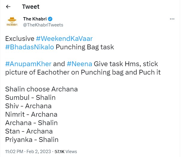 इस टास्क में घरवालों ने पंचिंग बैग पर तस्वीर लगाई और कसकर मुक्का मारा और अपनी दिल में दबी सभी बातों को उगल दिया। शालीन ने अर्चना पर, सुम्बुल ने शालीन पर, शिव-निमृत और एमसी स्टैन ने अर्चना पर अपनी भड़ास निकाली।