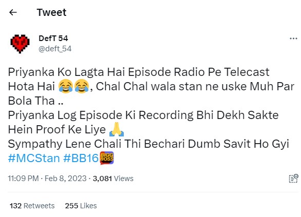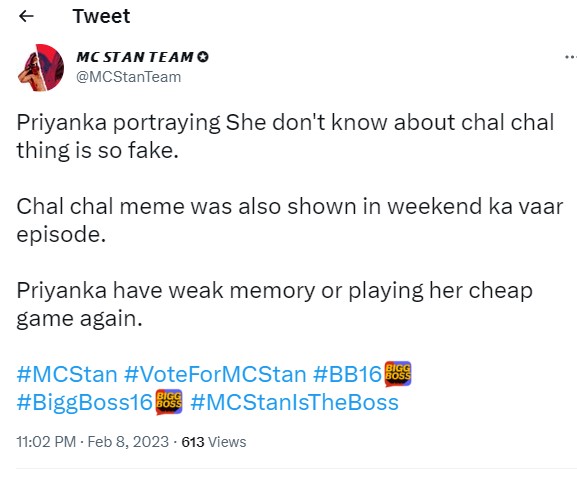 हालांकि, ग्रैंड फिनाले से बस अब कुछ ही दिन दूर शो की सबसे मजबूत कंटेस्टेंट प्रियंका चहर चौधरी अपने को-कंटेस्टेंट एमसी स्टैन को गलत दिखाने के चक्कर में ऐसी गलती कर बैठी, जिसके बाद सोशल मीडिया पर लोग एक्ट्रेस की याददाश्त और हिपोक्रेसी पर सवाल कर रहे हैं।