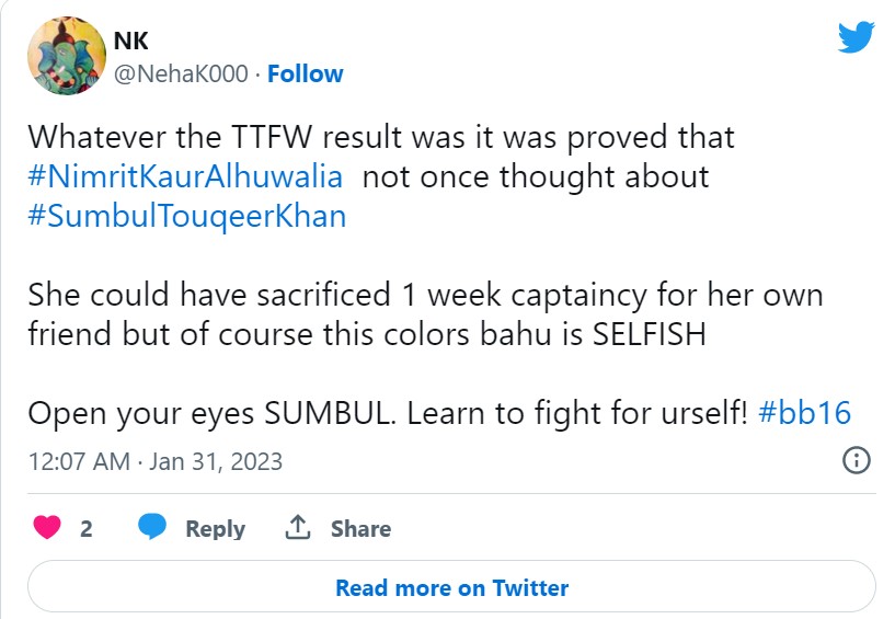 सुंबुल को सपोर्ट करते हुए एक अन्य यूजर ने कहा, "टिकट टू फिनाले का रिजल्ट जो भी हो, लेकिन ये साफ हो गया कि निमृत ने एक बार भी सुंबुल के बारे में नहीं सोचा। वो अपनी दोस्त के लिए एक हफ्ते की कैप्टेंसी की कुर्बानी दे सकती थीं, लेकिन जाहिर बात हैं कि कलर्स की बहू बेहद चालाक है। अपनी आंखें खोलो सुंबुल और खुद के लिए लड़ना सीखो।"
