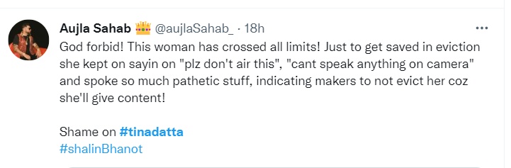 सोशल मीडिया पर इसे लेकर टीना को जमकर ट्रोल किया जा रहा है। किसी ने लिखा कि, 'टीना तुम्हें जब पहले पता था तो क्यों इतनी क्लोज हो रही थी शालीन से'। तो किसी ने पूछा कि, 'ऐसा क्या मांग लिया जो बता नहीं सकती हो'। बिग बॉस के विनर रह चुके मनु पंजाबी भी ट्वीट कर टीना से यहीं पूछ रहे हैं कि आखिर शालीन ने मांग क्या लिया था। तो एक यूजर ने टीना से कहा कि तुम्हें शर्म आनी चाहिए एक लड़के के कैरेक्टर की धज्जियां उड़ा रही हो।