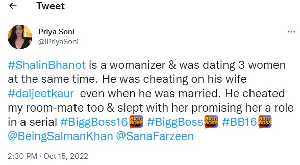 प्रिया सोनी ने अपनी बात को आगे बढ़ाते हुए कहा था, 'इसके बाद शालीन और एक्ट्रेस की रोज मुलाकात होने लगी और दोनों के फिजिकल रिलेशन बन गए। शालीन ने अपनी फिजिकल जरूरतें पूरा करने के लिए उसका इस्तेमाल किया और फिर उसे छोड़ दिया।