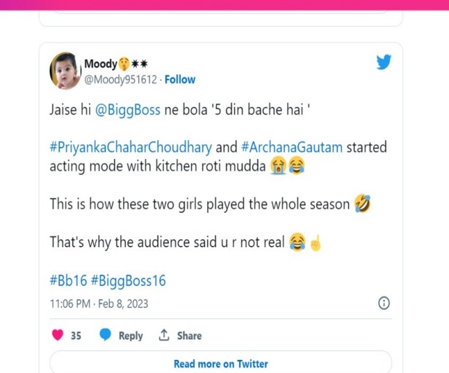 शिव, स्टैन और शालीन ने समझ लिया कि जैसे ही बिग बॉस ने 5 दिन का हिंट दिया, दोनों लड़ने लग गईं। आपको याद दिला दें कि पहले भी अर्चना और प्रियंका ने ये माना है, दोनों बहुत बार सिर्फ फुटेज के लिए घर में लड़ीं हैं। अब सोशल मीडिया पर फैंस इन दोनों का जमकर मजाक उड़ा रहे हैं। लोग कह रहे हैं कि इन दोनों लड़कियों ने हमेशा यहीं किया है, किसी और की लड़ाई में घुसती हैं।