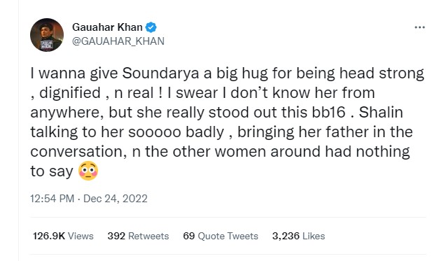 गौहर खान ने सौंदर्या के सपोर्ट में लिखा, 'मैं सौंदर्या को हमेशा अपनी बात पर डटे रहने, सम्मानजनक और रियल रहने के लिए जोर से गले लगाना चाहती हूं। मैं कसम खाती हूं मैं उसे किसी भी तरह से नहीं जानती लेकिन बिग बॉस 16 में वो सच में सबसे अलग और बेहतर नजर आईं हैं। शालीन उससे कितनी बद्तमीजी से बात कर रहा है, उसके पिता को बीच में लेकर आ रहा है और मौजूद बाकी महिलाओं को इससे कोई दिक्कत नहीं है।'
