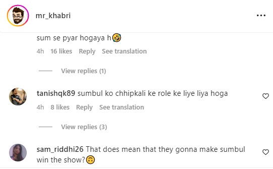 दूसरे यूजर ने लिखा, 'एकता उसे धरमपत्नी में चाहती थी, लेकिन उसने बिग बॉस चुन लिया। अब वह उसे नागिन में लाना चाहती है'। अन्य यूजर ने लिखा, 'नागिन सुम्बुल की पर्सनैलिटी से बिलकुल भी मैच नहीं होता'।