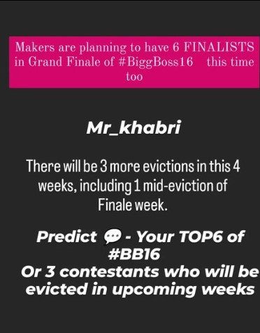 शो को एक्सटेंशन मिलने के बाद बिग बॉस अब 12 फरवरी तक ऑन एयर होगा, इस शो के ग्रैंड फिनाले पर ऑडियंस की पूरी नजर बनी हुई है। आने वाले चार हफ्ते घरवालों के लिए और भी मुश्किल भरे रहने वाले हैं। बिग बॉस हाउस में अभी टोटल 9 कंटेस्टेंट बाकी है। मिस्टर खबरी की रिपोर्ट्स की मानें तो आने वाले चार हफ्तों में बिग बॉस के घर में तीन और एविक्शन होंगे, जिसमें फिनाले वीक से पहले-पहले एक एविक्शन होगा। इतना ही नहीं उनके प्रेडिक्शन के अनुसार आने वाले वीक में ही बीते हफ्ते की तरह तीन कंटेस्टेंट इस शो को अलविदा कह सकते हैं। रिपोर्ट्स की मानें तो सुम्बुल और सौंदर्या और टीना में से किसी एक कंटेस्टेंट का सफर मिड वीक में खत्म हो सकता है।