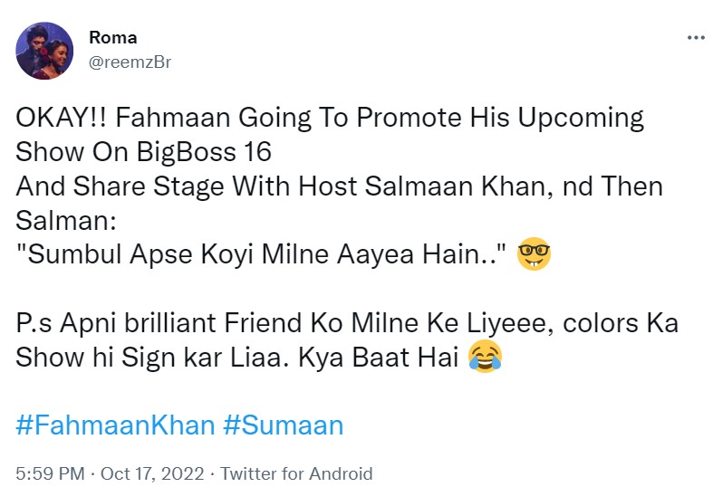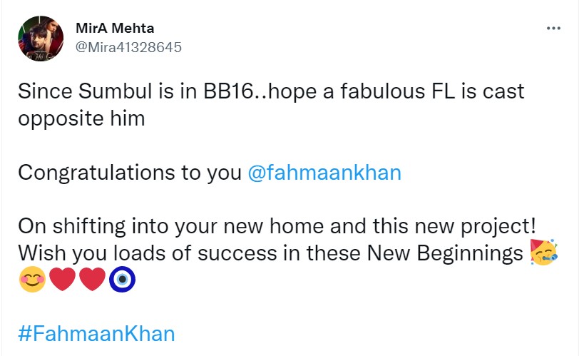 एक अन्य यूजर ने कहा, "सुंबुल बिग बॉस 16 के घर में है...ऐसे में उम्मीद करता हूं कि आपके अपोजिट एक अच्छी कास्ट हो। नये घर में शिफ्ट होने के लिए और इस नए प्रोजेक्ट के लिए फहमान खान आपको मुबारक हो। इस नए सफर में आपको खूब कामयाबी मिले।"