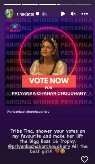 शालीन के साथ घर में लव एंगल खेलने वालीं टीना दत्ता ने ग्रैंड फिनाले से तीन दिन पहले अपने सोशल मीडिया पर एक पोस्ट शेयर किया। इस पोस्ट में प्रियंका चहर चौधरी नजर आ रही हैं। टीना दत्ता ने अपनी ट्राइब से ये गुजारिश की कि वह प्रियंका चहर चौधरी को ही विनर बनाए।