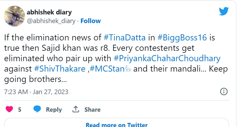 नई दिल्ली, जेएनएन। बिग बॉस 16 से टीना दत्ता बाहर जा चुकी है। वैसे तो खबर ये भी थी कि पिछले हफ्ते भी टीना दत्ता को सबसे कम वोट्स मिले थे पर उन्हें बचाने के चक्कर में बिग बॉस के मेकर्स ने सौंदर्या शर्मा की बलि चढ़ा दी थी। हालांकि टीना के जाने की खबर पर सोशल मीडिया पर लोग मिक्सड रिएक्शन दे रहे हैं। कुछ को लग रहा है कि टीना के जाने से बोरियत दूर होगी तो वही किसी का कहना है कि साजिद ने सच कहा था।