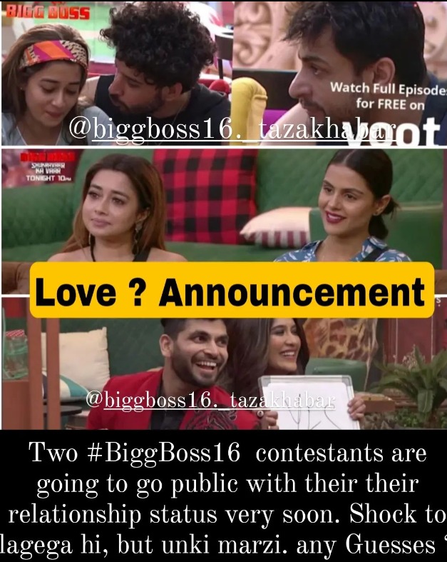 बिग बॉस 16 के घर में प्रियंका चाहर चौधरी, अंकित गुप्ता, शालीन भनोट- टीना दत्ता, गौतम विग- सौंदर्या शर्मा और निमृत कौर अहलूवालिया- शिव ठाकरे के बीच प्यार होने की फैंस ने संभावनाएं जताई थी। शो से जुड़ी अपडेट और गॉसिप शेयर करने वाले एक फैन पेज ने जानकारी शेयर की है, जिसके अनुसार बिग बॉस के दो पॉपुलर कंटेस्टेंट्स लव अनाउंसमेंट करने वाले हैं।
