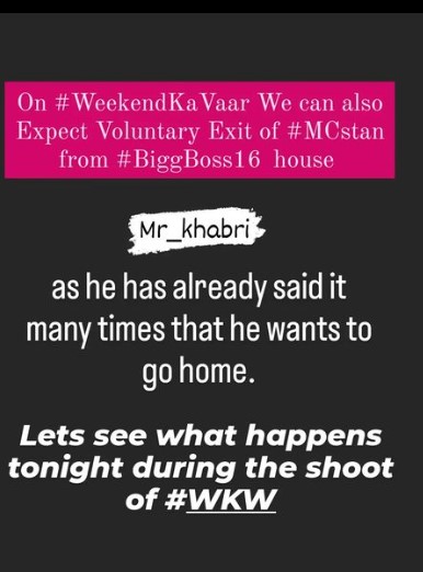बिग बॉस के घर में शालीन भनोट से लेकर एमसी स्टैंड, टीना दत्ता और अंकित गुप्ता सहित कई ऐसे कंटेस्टेंट हैं, जो घर से बाहर आने की बात कर चुके हैं, लेकिन रिपोर्ट्स हैं कि एक कंटेस्टेंट अब इतने बड़े मंच का हिस्सा नहीं रहना चाहता और वह इस शो को बीच में ही अलविदा कह सकता है। मिस्टर खबरी ने अपने इंस्टाग्राम अकाउंट पर एक पोस्ट शेयर करते हुए ये बताया कि वीकेंड के वार में रैपर एमसी स्टैंड वालेंट्री एग्जिट ले सकते हैं। एमसी स्टैंड बिग बॉस के ऐसे कंटेस्टेंट हैं जो अक्सर बिग बॉस के घर से उन्हें निकालने की बात करते हैं। कुछ दिनों पहले ही एमसी स्टैंड निमृत और शिव के सामने ये कहते हुए नजर आए थे कि वह पैसे देकर इस घर से बाहर जाने के लिए बिलकुल तैयार हैं। जिसके बाद निमृत ने उन्हें कहा था कि तुम्हें पता है कितना अमाउंट देना होगा, तो एमसी ने उनकी हां में हां मिलाई थी। इस बात को सुनकर निमृत उनसे ये कहते हुए नजर आई थीं कि वह उन्हें वो पैसे दे दे जो बिग बॉस को दे रहे हैं।