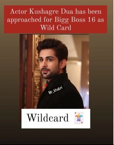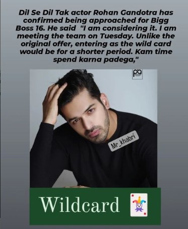 मिस्टर खबरी ने अपने इंस्टाग्राम अकाउंट पर ये जानकारी साझा की कि टेलीविजन के दो बड़े एक्टर्स फाइनली वाइल्ड कार्ड एंट्री बनकर बिग बॉस के घर में प्रवेश करने वाले हैं। वाइल्ड कार्ड एंट्री के रूप में जिन दो टेलीविजन हार्टथ्रोब्स के नाम सामने आ रहे हैं, उसमें पहला नाम 'गुम हैं किसी के प्यार में' एक्टर कुशाग्रे दुआ का है और दूसरा नाम 'दिल से दिल तक' और 'सिलसिला-बदलते रिश्तों का' शो में नजर आए एक्टर रोहन गंदोत्रा का।
