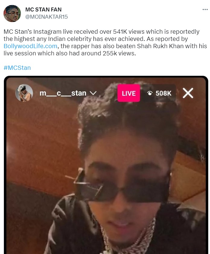 एमसी स्टैन गुरुवार को बिग बॉस 16 से बाहर आने के बाद पहली बार फैंस के साथ जुड़े। उन्होंने इंस्टाग्राम पर एक लाइव सेशन किया, जहां देखते ही देखते 500 से ज्यादा लोग जुड़ गए। इसके साथ ही स्टैन ने इतिहास रच दिया। स्टैन भारत के पहले सेलिब्रिटी बन गए हैं, जिनके लाइव सेशन में 541 हजार व्यूज मिले है। रैपर से पहले ये खिताब शाह रुख खान के पास था, उनके वीडियो पर 255 हजार व्यूज मिले थे। इसके साथ ही स्टैन इंस्टाग्राम के सबसे ज्यादा देखे जाने वाले लाइव स्ट्रीमिंग की टॉप 10 लिस्ट में शुमार हो गए हैं।