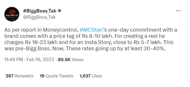 इंस्टाग्राम पर इतने व्यूज मिलने के बाद अब फैंस एमसी स्टैन की इंस्टा इनकम को लेकर उत्सुक हो गए हैं। आइए जानते हैं कि स्टैन अपनी इंस्टा रील और इंस्टा पोस्ट के लिए कितना चार्ज करते हैं। मनी कंट्रोल की खबर के अनुसार, एमसी स्टैन इंस्टा पर एक रील बनाने के लिए 18-23 लाख रुपये के बीच चार्ज करते हैं। वहीं, इंस्टा स्टोरी के लिए 5 से 7 लाख रुपये चार्ज करते हैं। रिपोर्ट के अनुसार, स्टैन बिग बॉस 16 में जाने के पहले इतने पैसे लेते थे। अब विनर बनने के बाद उनकी फीस में 30 से 40 प्रतिशत की बढ़ोतरी होना तय है।