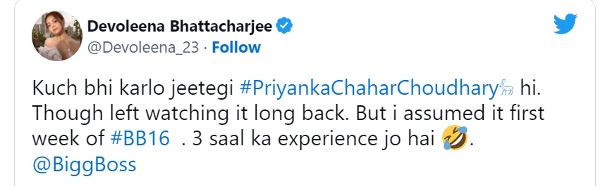सिर्फ युविका ही बल्कि देवोलीना भट्टाचार्जी ने भी ट्वीट कर कहा- कुछ भी कर लो जीतेगी तो प्रियंका ही, हालांकि ये शो मैंने काफी पहले ही देखना छोड़ दिया है। पर मुझे पहले हफ्ते से ही पता चल गया था। 3 साल का एक्सपीरियंस जो है मुझे बिग बॉस का। इन दोनों के ट्वीट से ये साफ हो गया कि प्रियंका का पलड़ा इसलिए भी भारी है क्योंकि वो कलर्स के शो उड़ारियां में नजर आ चुकी हैं।