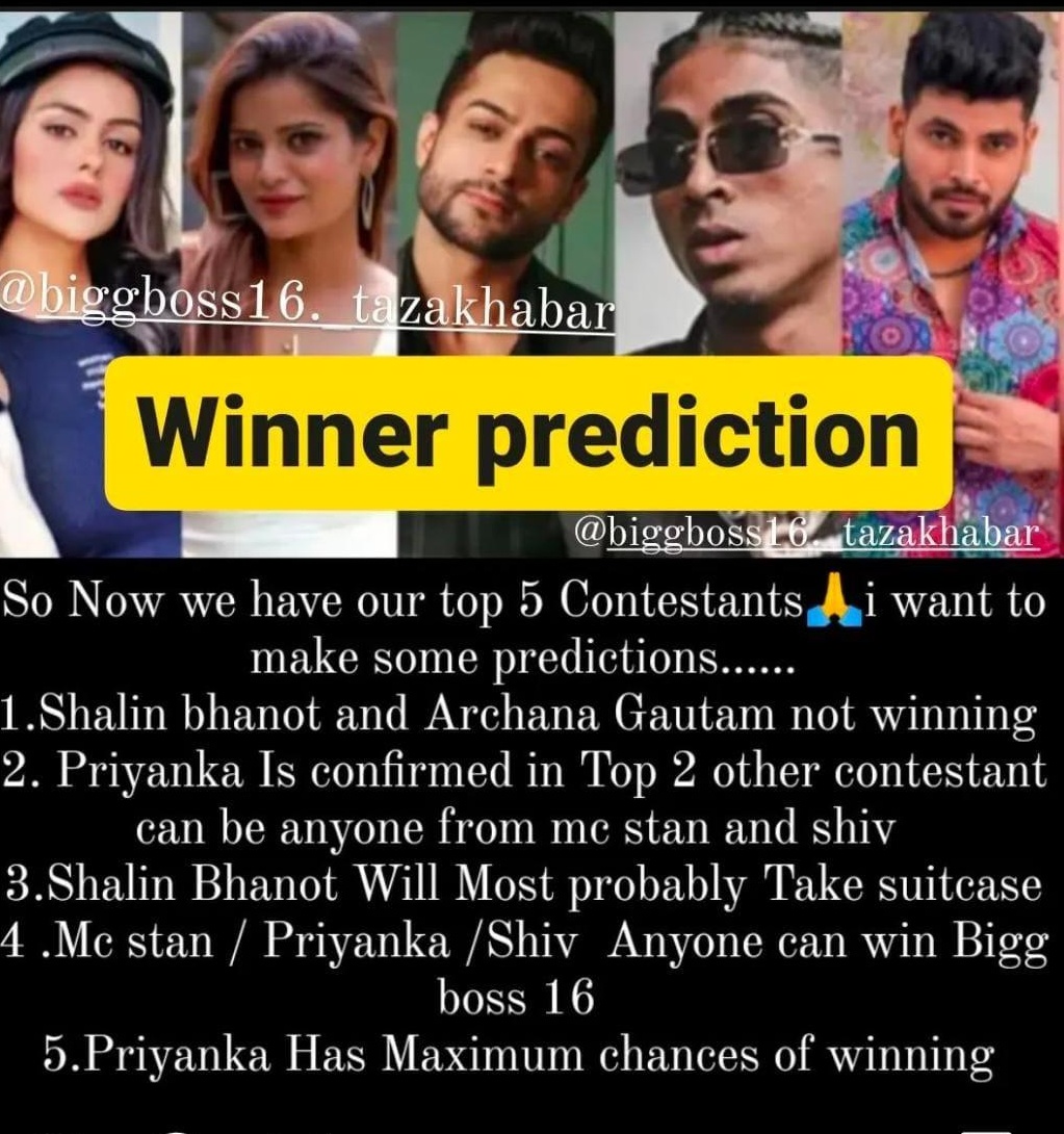 शो के फाइनलिस्ट को लेकर जो नाम सामने आ रहा है वो है, प्रियंका चाहर चौधरी और शिव ठाकरे का। इनसे भी प्रियंका को सोशल मीडिया से लेकर सेलेब्स तक, हर कोई विनर मान रहा है।