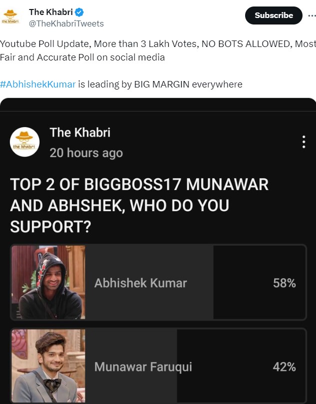 बिग बॉस 17 के मजबूत कंटेस्टेंट मुनव्वर फारुकी को अभिषेक कुमार मात दे रहे हैं। इस वोटिंग में अभिषेक के खाते में 58% वोट्स आए हैं, जबकि मुनव्वर को सिर्फ 42% वोट्स मिले हैं। फिनाले से पहले सामने आया ये पोल बिग बॉस सीजन 17 के विनर के चेहरे से पर्दा उठाने का काम कर रहा है। हालांकि, विनर की घोषणा होने तक कुछ भी पक्के तौर पर नहीं कहा जा सकता है।