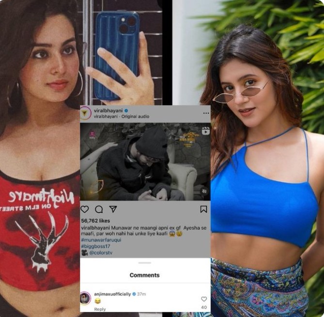 बिग बॉस 17 से सामने आए मुनव्वर फारुकी के इस वीडियो को पैपराजी वीरल भयानी ने भी शेयर किया है, जिस पर अंजलि अरोड़ा ने रिएक्ट किया है। उन्होंने कहा तो कुछ नहीं, लेकिन एक हंसने वाली इमोजी कमेंट बॉक्स में ड्रॉप कर दी। अंजलि अरोड़ा का ये रिएक्शन सोशल मीडिया पर हर किसी का ध्यान खींच रहा है।