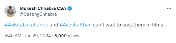 इस शो से बाहर आते ही अंकिता लोखंडे और मुनव्वर फारुकी की एक्स गर्लफ्रेंड और शो में वाइल्ड कार्ड एंट्री बनकर आईं आयशा खान को एक बड़ी फिल्म मिल गयी है। बॉलीवुड के फेमस कास्टिंग डायरेक्टर मुकेश छाबड़ा ने अपने एक्स अकाउंट(Twitter)पर लिखा, "अंकिता लोखंडे और आयशा खान को फिल्म में कास्ट करने का इंतजार नहीं कर सकता"।