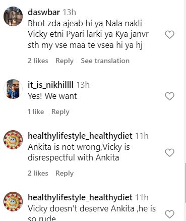 दूसरे यूजर ने लिखा, "विक्की अंकिता को बिल्कुल भी डिजर्व नहीं करता है, क्योंकि वह बहुत ही रूढ़ है"। कई यूजर्स ने कमेंट बॉक्स में 'यस' आंसर दिया है। एक अन्य यूजर ने विक्की जैन (Vicky Jain)के एटीट्यूड पर बात करते हुए लिखा, "मुझे विक्की जैन का घमंड समझ नहीं आता। वह एक वर्किंग लेडी है। उन्हें कुकिंग के लिए समय नहीं मिला, इसलिए शायद वह अच्छी कुक नहीं है, इसमें क्या हो गया है"।