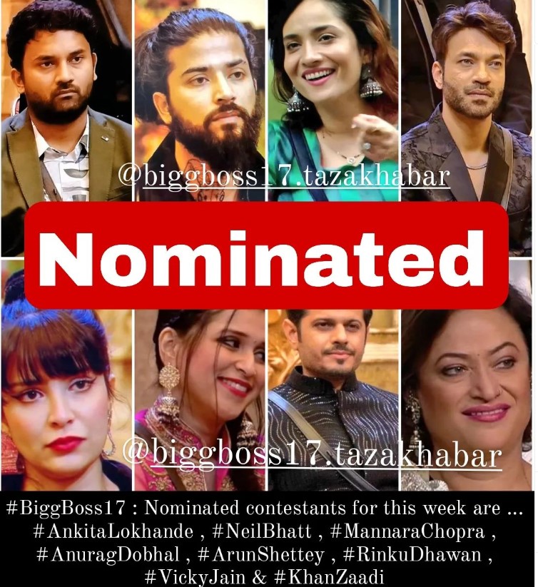 बिग बॉस ने सोमवार को घर में नॉमिनेशन के लिए टास्क करवाया। शो के एक फैन पेज ने नॉमिनेशन से जुड़ी अपडेट शेयर की है। जानकारी के अनुसार, इस बार नॉमिनेशन की लिस्ट में घर के 8 सदस्यों के नाम शामिल है। इनमें अरुण मशेट्टी, अनुराग डोभाल, अंकिता लोखंडे, विक्की जैन, खानजादी, मनारा चोपड़ा, नील भट्ट और रिंकू धवन का नाम शामिल है।