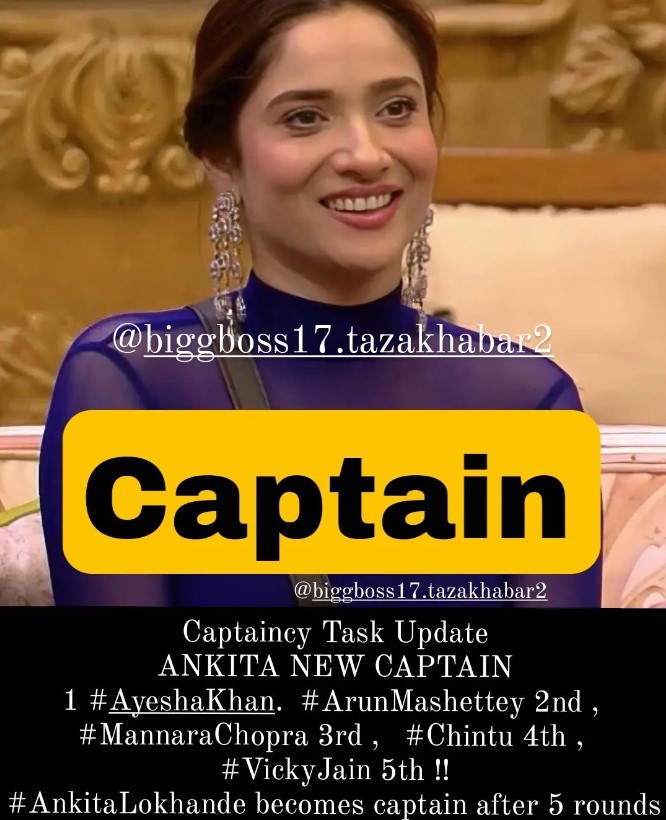 बिग बॉस 17 से जुड़ी अपडेट शेयर करने वाले फैन पेज के अनुसार, शो का नया कैप्टन टीवी की बहू अंकिता लोखंडे बनी है। एक्ट्रेस के साथ मुकाबले में आयशा खान, अरुण मशेट्टी, मनारा चोपड़ा, सामर्थ जुरेल और विक्की जैन थे। लगभग पांच राउंड्स के बाद अंकिता लोखंडे घर की विनर बनीं। अब देखना होगा वो घर की बागडोर कैसे संभालती हैं।