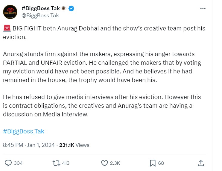 अनुराग डोभाल ने ये भी दावा किया कि अगर वो बिग बॉस 17 में अंत तक रहते, तो विनर बनकर ही बाहर जाते। अनुराग ने शो से बाहर आने के बाद इंटरव्यू देने से भी इनकार कर दिया। हालांकि, बिग बॉस की क्रिएटिव टीम और अनुराग की पीआर टीम से बात कर रही है, क्योंकि ऐसा करना शो के कॉन्ट्रैक्ट के खिलाफ है। हालांकि, मेकर्स और अनुराग डोभाल की तरफ से अभी आधिरारिक तौर पर कोई एलान नहीं किया गया है।