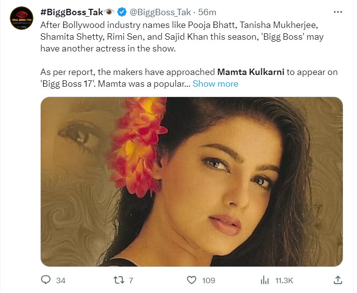 ममता कुलकर्णी ने सलमान खान के साथ फिल्म करण- अर्जुन में काम किया था, जो ब्लॉकबस्टर रही थी। अब अगर एक्ट्रेस बिग बॉस 17 में हिस्सा लेती हैं, तो ये दोनों का रियूनियन भी होगा।