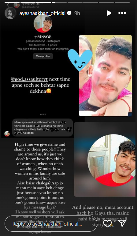 आयशा खान ने अपना गुस्सा व्यक्त करते हुए आगे लिखा, "ऐसे कैसे चलेगा? आप जो मन में आए कह देंगे, क्योंकि आपको पॉइंट आउट करने वाला कोई नहीं है।क्योंकि किसी को ये नहीं पता है कि आपने किसे क्या मैसेज किया है? मेरे चाहने वालों ने मुझे ये कहा था कि मैं इस तरह के घटिया लोगों को अटेंशन न दूं, लेकिन हम बोलेंगे नहीं तो बदलाव आएगा कैसे?