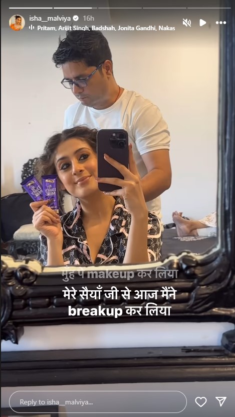 ईशा मालवीय ने अपनी इंस्टा स्टोरी में एक वीडियो शेयर किया है। वीडियो में एक्ट्रेस शीशे के सामने बैठीं मेकअप करवाते हुए नजर आ रही हैं। पोस्ट में उन्होंने अनुष्का शर्मा और रणबीर कपूर की फिल्म ए दिल है मुश्किल का ब्रेकअप सॉन्ग जोड़ा है।