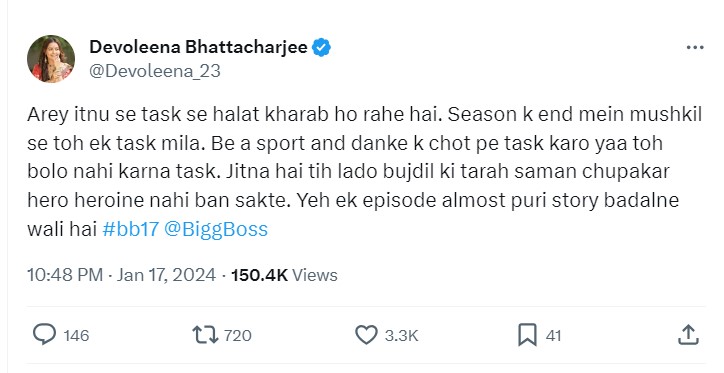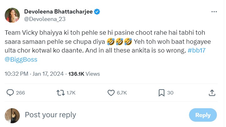 देवोलीना भट्टाचार्य ने एक्स पर बिग बॉस 17 को लेकर पोस्ट शेयर करते हुए कहा, "टीम विक्की भैया के तो पहले से ही पसीने छूट रहे हैं तभी तो सारा सामान पहले से छुपा दिया। ये तो वो बात होगी उल्टा चोर कोतवाल को डांटे। और इन सबमें अंकिता बहुत गलत है।"