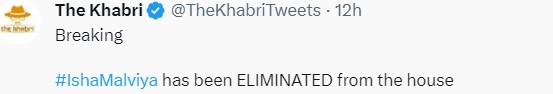 ईशा मालवीय के एलिमिनेशन से पहले विक्की जैन के एलिमिनेट होने की भी चर्चा थी। बीते कुछ दिनों में अंकिता लोखंडे के साथ झगड़े के कारण वह यूजर्स के निशाने पर रहे हैं।