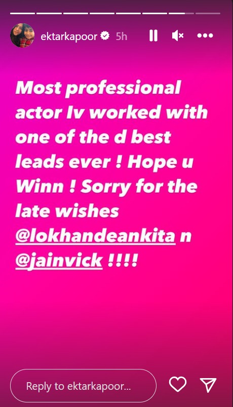 अंकिता लोखंडे के पक्ष में अब एकता कपूर उतर आई हैं, जिनसे बड़ा प्रोड्यूसर भारतीय टेलीविजन की दुनिया में और कोई नहीं है। एकता ने अपने ऑफिशियल इंस्टाग्राम स्टोरी सेक्शन में एक्ट्रेस के लिए एक पोस्ट शेयर करते हुए कहा, मैंने अब तक जितने लीड एक्टर्स के साथ काम किया है, उनमे सबसे ज्यादा प्रोफेशनल अंकिता लोखंडे हैं। मुझे उम्मीद है कि आप विनर बनेगी। देरी से बधाई देने के लिए माफ करना। इस नोट में एकता ने विक्की जैन को भी टैग किया।