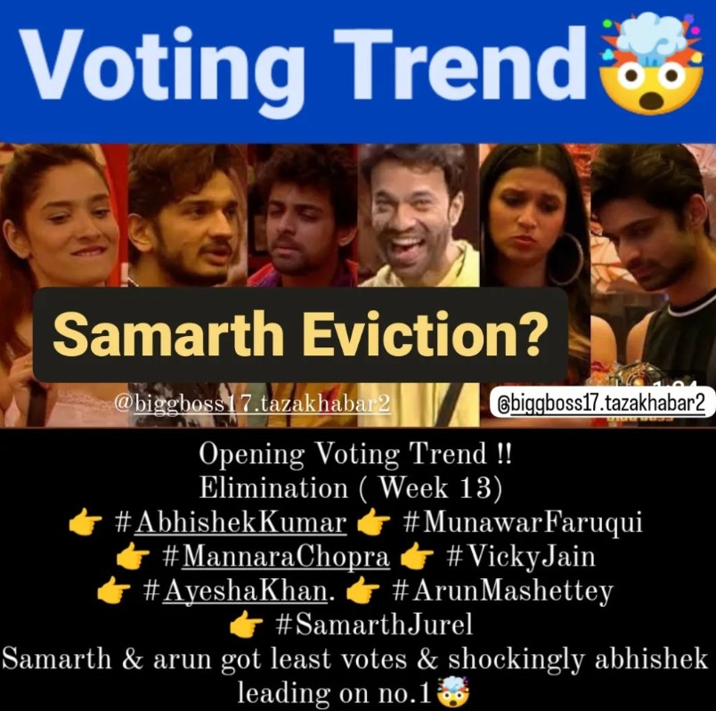बिग बॉस 17 के नॉमिनेटेड कंटेस्टेंट्स के वोटिंग ट्रेंड से जुड़ी खबर आई है। बिग बॉस 17 की अपडेट शेयर करने वाले फैन पेज ने ये जानकारी शेयर की है। खबर के अनुसार, लेटेस्ट वोटिंग ट्रेंड में अब तक नंबर वन रहने वाले मुनव्वर फारुकी का ताज अभिषेक कुमार ने छीन लिया है। वहीं, अभिषेक से थप्पड़ खाने वाले समर्थ जुरेल डेंजर जोन में आ गए हैं।