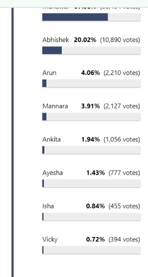 फिलहाल वोटिंग लिस्ट में जो कंटेस्टेंट सबसे आगे चल रहा है, वो मुनव्वर फारुकी हैं, जिन्हें 67.29% वोट्स मिले, इसके बाद लिस्ट में दूसरे नंबर पर अभिषेक, तीसरे नंबर पर अरुण माशेट्टी, चौथे नंबर पर मनारा चोपड़ा, पांचवें नंबर पर अंकिता, छठे नंबर पर आयशा, सातवें नम्बर पर ईशा मालवीय और सबसे कम वोट्स के साथ सबसे नीचे हैं विक्की जैन।