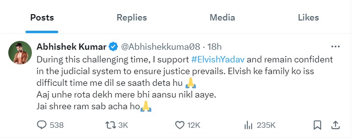 अभिषेक कुमार ने अपने एक्स अकाउंट पर एल्विश यादव के लिए एक पोस्ट शेयर किया है। उन्होंने ट्वीट करते हुए लिखा, "इस मुश्किल की घड़ी में मैं एल्विश यादव का साथ देता हूं और मुझे न्यायिक व्यवस्था पर पूरा विश्वास है कि जस्टिस जरुर होगा। एल्विश यादव के परिवार का इस मुश्किल वक्त में दिल से साथ देता हूं। आज उन्हें रोता देख मेरे भी आंसू निकल आए। जय श्री राम सब अच्छा हो।"