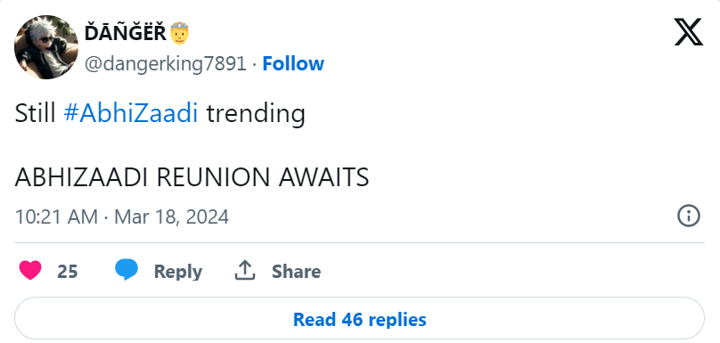 दूसरे यूजर ने लिखा, "रियूनियन तब होगा जब ये होना होगा, फिलहाल तो मैं बस फिंगर क्रॉस करके बैठा हूं"। अन्य यूजर ने लिखा, "ये अभिजादी के फैंस के लिए एक पॉजिटिव मैसेज है, कोई शो ऑफ नहीं, सिर्फ प्योर बॉन्डिंग"।
