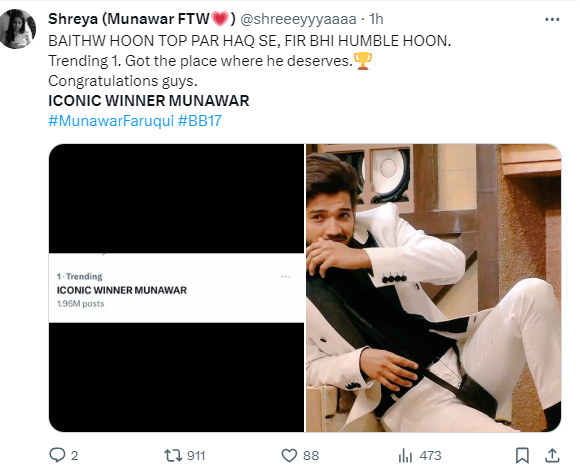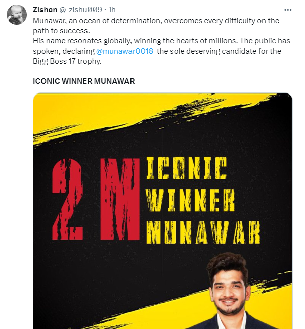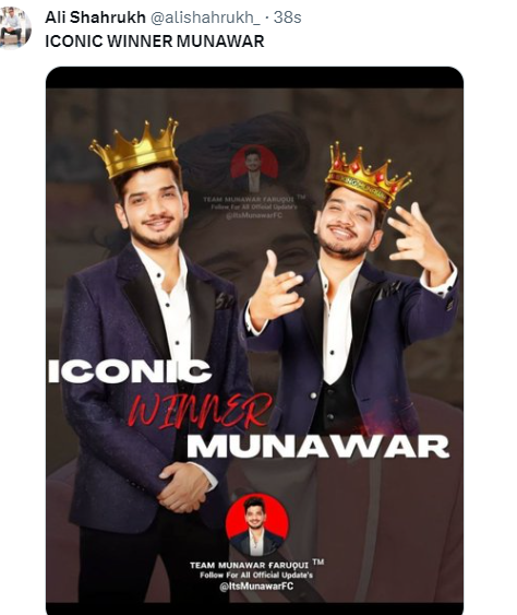 हाल ही में स्टैंड अप कॉमेडियन मुनव्वर फारुकी (Munawar Faruqui)के फैंस ने ट्विटर पर 'आइकॉनिक विनर मुनव्वर' का ट्रेंड चलाया और सबसे शातिर खिलाड़ी माने कंटेस्टेंट को फैसले से पहले ही विनर घोषित कर दिया है।
