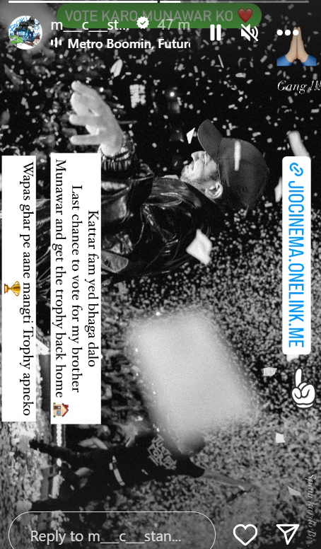 एमसी स्टेन ने उसके कैप्शन में लिखा, 'वोट करो मुनव्वर को। कट्टर फेम येड भगा डालो। मेरे भाई को वोट करने का लास्ट चांस। मुनव्वर ट्रॉफी घर लेकर आना। वापस घर पे आने मांगती ट्रॉफी अपने को'। अब सोशल मीडिया पर एमसी स्टेन का यह पोस्ट वायरल हो गया है।