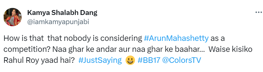 दरअसल, काम्या ने अपने सोशल मीडिया हैंडल एक्स पर एक ट्वीट करते हुए अरुण की तुलना बिग बॉस सीजन 1 के विनर राहुल रॉय से की। एक्ट्रेस ने लिखा 'ऐसा कैसे है कि कोई भी अरुण माशेट्टी को प्रतिस्पर्धी नहीं मान रहा है? ना घर के अंदर और ना घर के बाहर... वैसे किसको राहुल रॉय याद है।