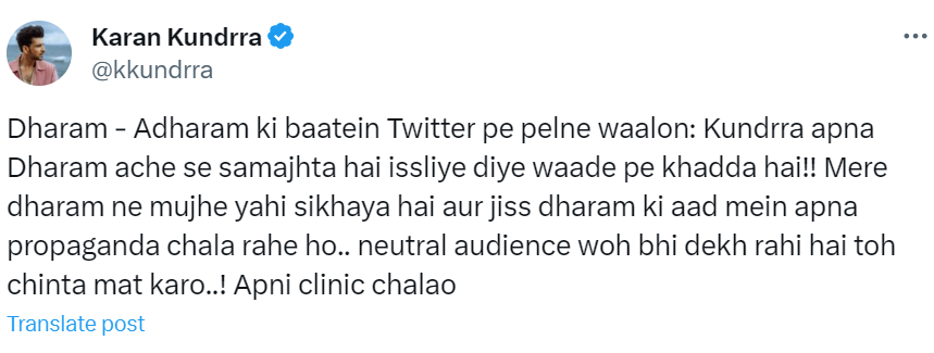 करण कुंद्रा ने अपने पोस्ट में लिखा, 'धर्म-अधर्म की बातें ट्विटर पर चलने वालों, कुंद्रा अपना धर्म अच्छे से समझता है, इसलिए दिए वादे पे खड़ा है। मेरे धर्म ने मुझे यही सिखाया है और जिस धर्म की आड़ में अपना प्रचार चला रहे हो, नेचुरल ऑडियंस वो भी देख रही है तो चिंता मत करो। अपना क्लिनिक चलाओ'।