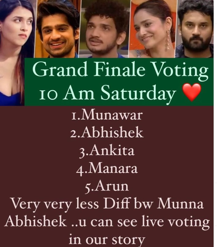 Bigg Boss 17 फेमस रियलिटी शो बिग बॉस 17 का सफर टेलीविजन पर कुछ ही घंटों में खत्म होने वाला है। शो में मुनव्वर फारुकी मनारा चोपड़ा अभिषेक कुमार अंकिता लोखंडे और अरुण माशेट्टी के बीच तगड़ा मुकाबला होते देखने को मिल रहा है। इस बीच लाइव वोटिंग में कौन किससे आगे है इसकी जानकारी भी सामने आ गई है।