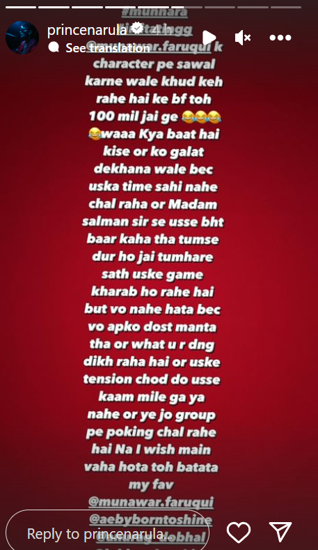 प्रिंस नरूला ने पोस्ट में लिखा 'मुनव्वर फारुकी के करैक्टर पर सवाल उठाने वाले खुद कह रहे हैं कि BF तो 100 मिल जाएंगे। वाह क्या बात है, किसी और को गलत दिखाने वाले, क्योंकि उसका समय सही नहीं चल रहा। इसके आगे उन्होंने लिखा 'या मैडम सलमान सर ने उसे बहुत बार कहा था कि तुमसे दूर हो जाए, तुम्हारे साथ उसका गेम खराब हो रहा है, लेकिन वो नहीं हटा, क्योंकि वो आपको दोस्त मानता था और तुम क्या कर रहे हो।