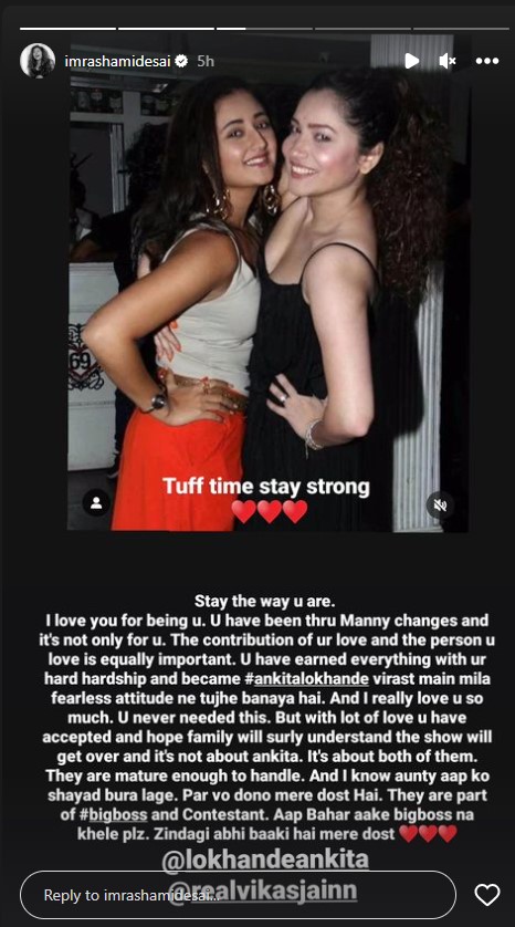 रश्मि देसाई ने कहा, "आप जैसी हैं वैसी ही रहिए। आप जैसी हैं मैं उससे प्यार करती हूं। आपने अपने अंदर बहुत बदलाव किए हैं और ये सिर्फ आपके लिए नहीं है। आपका प्यार और जिससे आप प्यार करती हैं उतना ही उसका प्यार करना भी जरूरी है। आपने सब कुछ अपनी कड़ी मेहनत से सब हासिल किया है और अंकिता लोखंडे विरासत में मिले निडर रवैया ने आपको बनाया है। मैं सच में आप से बहुत प्यार करती हूं। आपको इसकी कभी जरूरत नहीं पड़ी, लेकिन आपने बहुत प्यार से इसे एक्सेप्ट किया।"
