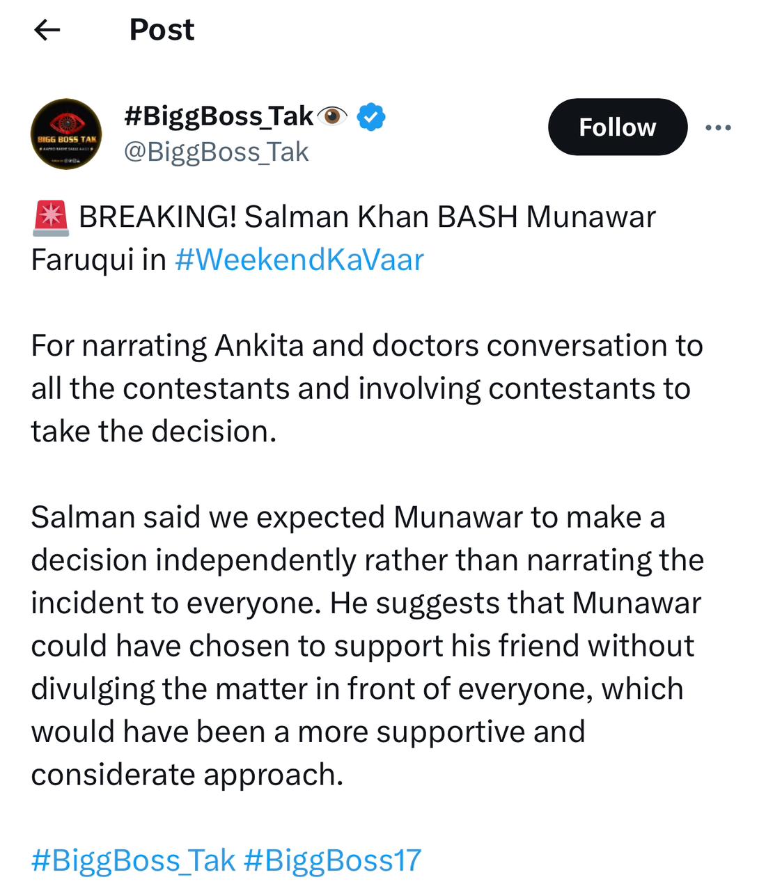 बिग बॉस 17 की अपडेट शेयर करने वाले फैन पेज ने वीकेंड का वार एपिसोड की जानकारी दी है। खबर के अनुसार, सलमान खान ने मुनव्वर फारुकी से कहा कि उन्हें बिग बॉस ने पर्सनली बुलाकर अंकिता का ऑडियो सुनाया था और खुद सजा देने का फैसला लेने के लिए कहा था, लेकिन उन्होंने ये बात सभी घरवालों को बता दी और उनके साथ मिलकर सजा तय की।