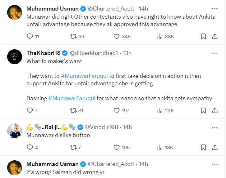 सलमान खान की मुनव्वर फारुकी को फटकार लगाने वाली बात फैंस के गले नहीं उतरी। कॉमेडियन के फैंस उनके सपोर्ट में उतर आए और भाईजान का विरोध किया। एक फैन ने कहा, "मुनव्वर ने सही किया, बाकी कंटेस्टेंट्स भी इस बात को जानने के हकदार हैं कि अंकिता अपनी ट्रीटमेंट का गलत फायदा उठा रही हैं।" एक अन्य फैन ने कहा, "ये पहले चाहते हैं कि मुनव्वर फारुकी फैसला और एक्शन ले और फिर ये लोग गलत फायदे लेने के लिए अंकिता को सपोर्ट करें।"